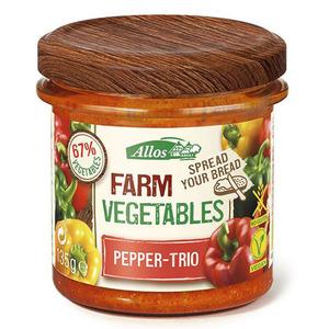 Allos Smørepålæg Paprika Trio Ø – 135 gr. Alle gode ting kommer trefoldigt: tredobbelt paprika, tredobbelt smag og tredobbelt nydelse. Kombinationen af det høje indhold af grøntsager, de fine grøntsagsstykker og den kun kortvarige opvarmning af ingrediens (Læs mere)